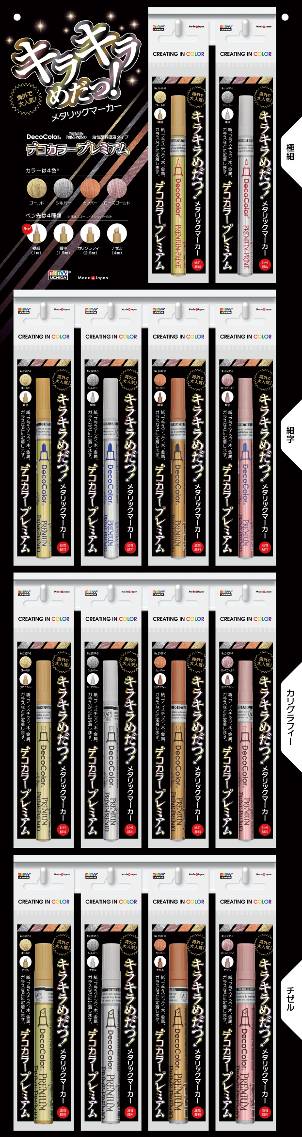 インク:油性顔料(直液タイプ) ペン先:細字・カリグラフィー・チゼル カラー:シルバー・ゴールド・カッパー・ローズゴールド(No.145はシルバー・ゴールドのみ) 出荷単位:3本 |