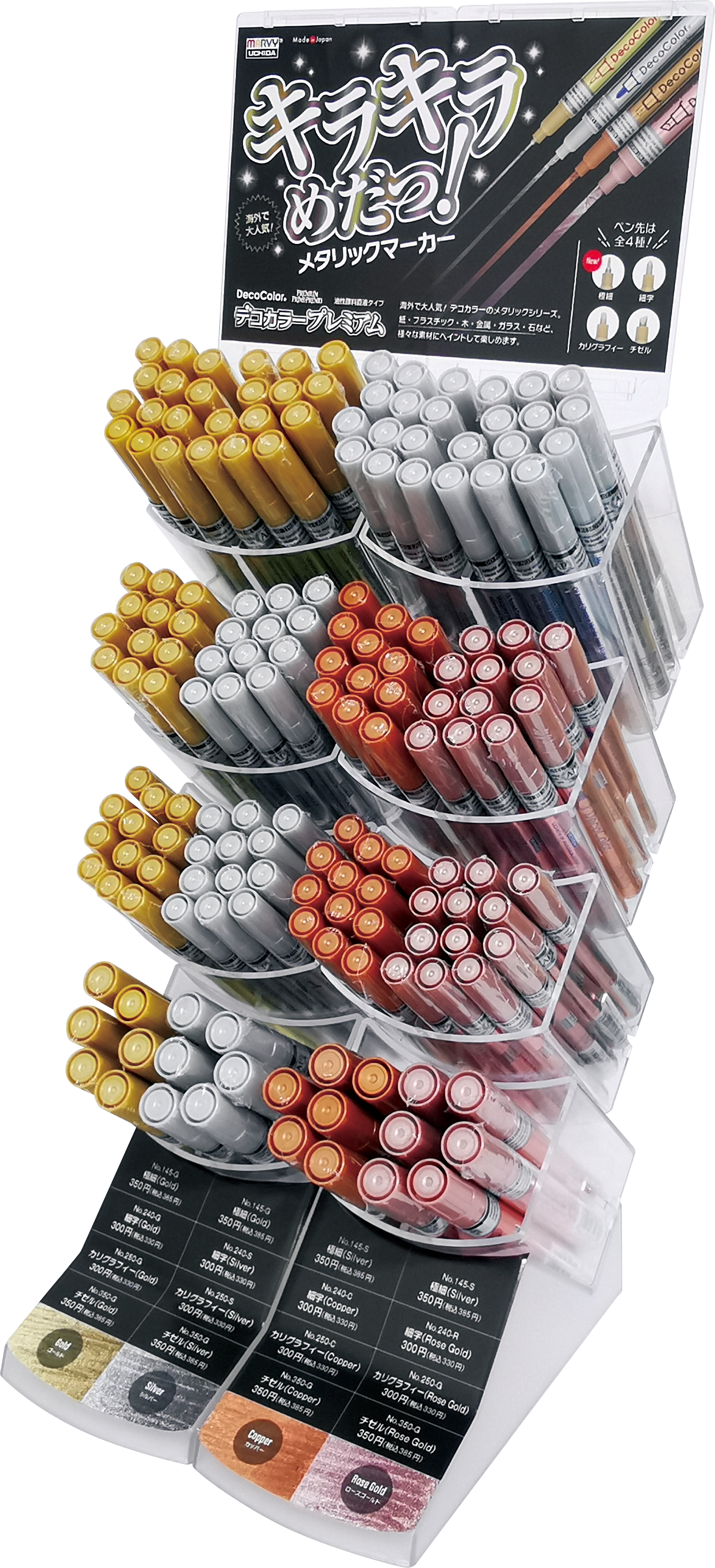No. 145-8D BOX型専用ディスプレイ 本体サイズ(1台の寸法) 1段の寸法:幅160×高さ445×奥行170mm 〈BOXごとの収納本数〉 極細:各24本 細字:各12本 カリグラフィー:各12本 チゼル:各6本 ※イメージ写真・マーカーは別売 ※写真は2台使用しています ※BOXごとの分割が可能で、売り場スペースに合わせた調整が可能です。 ![]() |